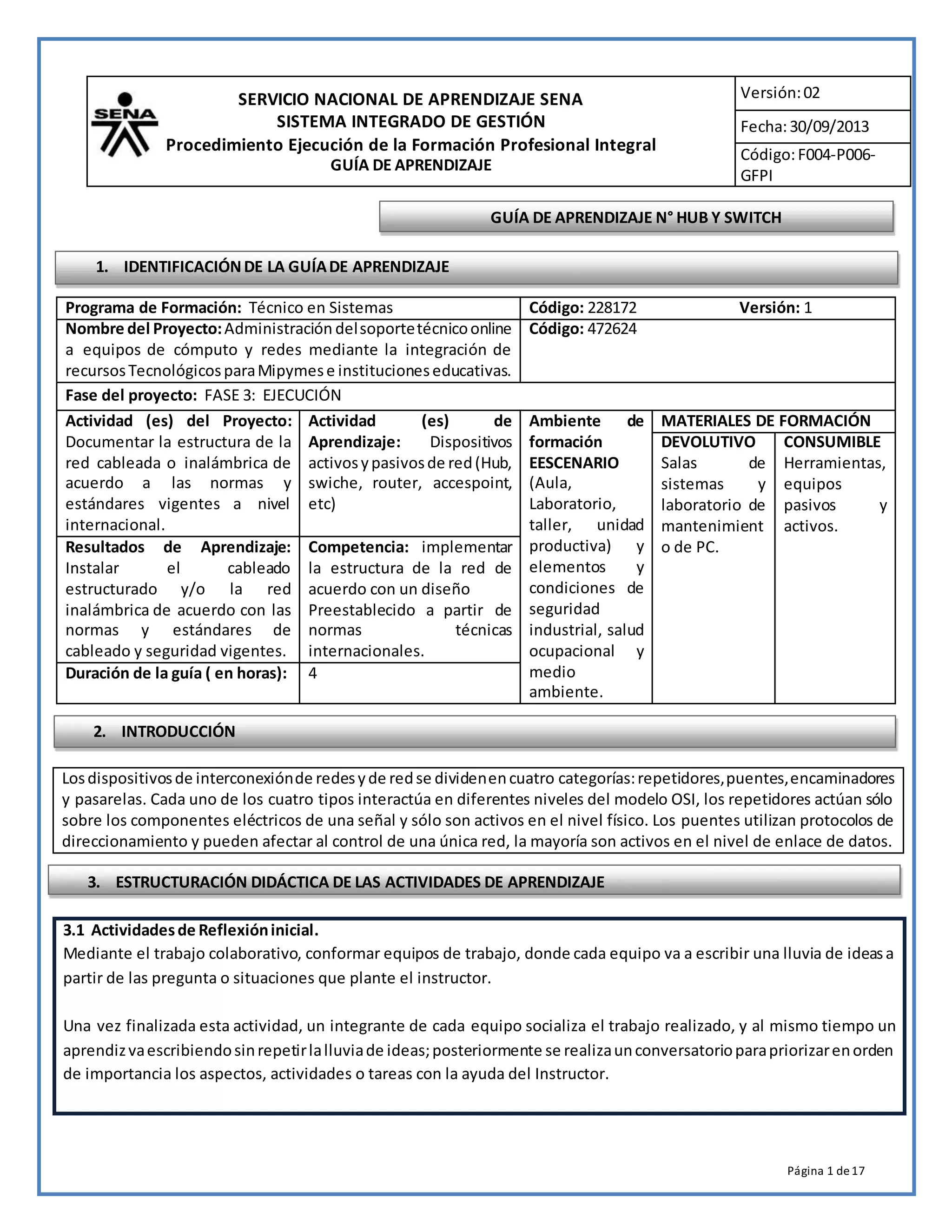 Este documento presenta una guía de aprendizaje sobre hubs y switches. La guía incluye actividades como investigar las características de hubs y switches, simular su funcionamiento usando Packet Tracer, y realizar foros y exposiciones para transferir el conocimiento. El objetivo es que los aprendices instalen el cableado estructurado y la red inalámbrica de acuerdo con normas y estándares, seleccionando los recursos físicos correctos y documentando la instalación. La guía proporciona recursos como un glosario y refer