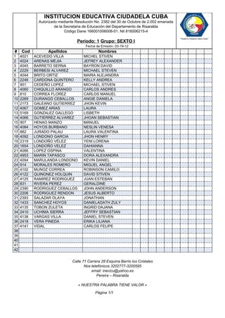 Este documento presenta la lista de estudiantes del grupo Sexto I de la Institución Educativa Ciudadela Cuba en Pereira, Risaralda, Colombia. Contiene 42 nombres de estudiantes con sus respectivos códigos, apellidos y nombres. También incluye la dirección, números telefónicos y correo electrónico de la institución educativa.