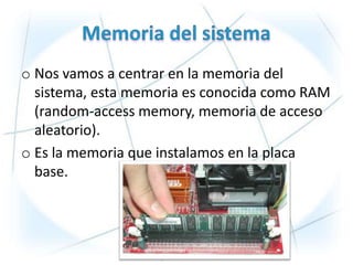 La memoria RAM es la memoria del sistema que se instala en la placa base y permite almacenar datos y programas en ejecución de forma más rápida que el disco duro. Existen diferentes tipos de módulos de memoria RAM como SIMM, DIMM y SO-DIMM, y tecnologías como SDRAM, DDR SDRAM y DDR2 SDRAM que mejoran el rendimiento. La memoria es fundamental para el funcionamiento del sistema y está sujeta a limitaciones de direccionamiento, encapsulado y otros factores.