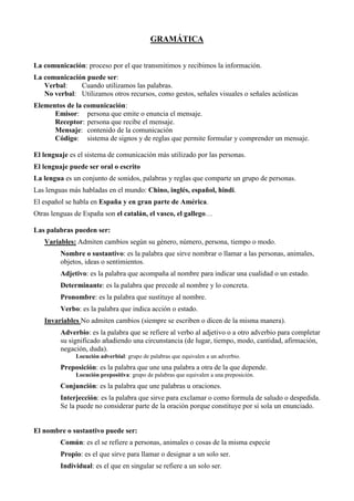 Este documento resume los conceptos básicos de la gramática española. Explica que la comunicación implica un emisor, receptor y mensaje, y que el lenguaje es el sistema de comunicación más utilizado por las personas. Describe las diferentes partes de la oración como sustantivos, adjetivos, verbos y pronombres, y explica sus características. También cubre temas como la conjugación verbal, tiempos, modos y clases de verbos.