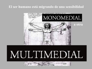 El documento describe cómo el ser humano está migrando hacia una sensibilidad dominada por imágenes digitales. Esto ha alterado los sistemas de comunicación y comprensión del mundo, haciendo que la imagen sea un valor esencial. La imagen problematiza la racionalidad lógica e involucra la emoción, permitiendo pensar el mundo de manera holística. Además, la digitalización ha liberado el poder de la imagen, facilitando la creación y circulación de contenidos multimedia e hipermedia e impulsando nuevas formas de pensamiento.
