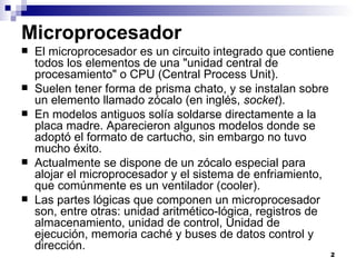 El documento describe los componentes y la historia del microprocesador. Explica que el microprocesador es un circuito integrado que contiene los elementos de una unidad central de procesamiento. Describe las partes lógicas que componen un microprocesador como la unidad aritmético-lógica, registros de almacenamiento y unidades de control y ejecución. También explica cómo funciona un microprocesador al ejecutar instrucciones almacenadas en la memoria principal.