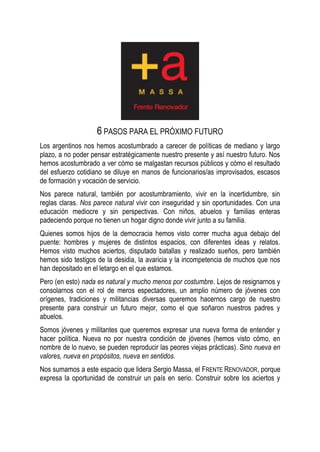 El documento propone 6 pasos para mejorar el futuro de Argentina: 1) independencia de poderes, 2) un sistema de partidos fuerte y estable, 3) una economía que promueva la equidad y la justicia social, 4) fomento de las economías regionales y las autonomías provinciales, 5) abordar la inseguridad mediante políticas de prevención e inversión, y 6) promover la inclusión e igualdad erradicando la pobreza. El objetivo general es construir un país con un gobierno justo que mejore las oportunidades y