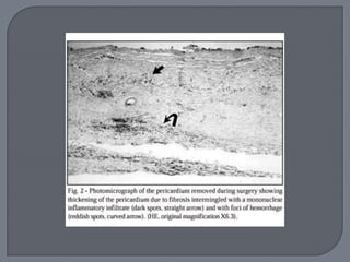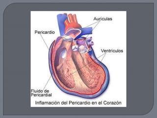 La pericarditis crónica se define como una inflamación del pericardio que dura más de 6 semanas. La causa más común es la tuberculosis, que afecta alrededor del 5% de los pacientes con tuberculosis pulmonar. El proceso evoluciona hacia la fibrosis y calcificación del pericardio, convirtiéndolo en una coraza rígida que dificulta el llenado cardíaco, lo que causa una acumulación de sangre en las venas y una disminución del gasto cardíaco, llevando a síntomas como