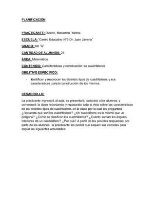 La practicante planea una lección sobre las características y construcción de cuadriláteros para un grupo de 6to grado. La lección incluirá una revisión de cuadriláteros, seguida de actividades de identificación y construcción de cuadriláteros usando el programa Geogebra. Los estudiantes aprenderán a dibujar cuadriláteros, marcar puntos medios y crear nuevos cuadriláteros uniendo esos puntos.