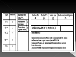 El documento describe el APACHE II (Acute Physiology and Chronic Health Evaluation), un sistema para cuantificar la gravedad de pacientes independientemente del diagnóstico. Se basa en 12 variables fisiológicas, la edad y enfermedades crónicas para generar una puntuación predictiva de mortalidad. También presenta otros scores como SOFA y Ranson para evaluar disfunción de órganos y gravedad de pancreatitis aguda respectivamente.