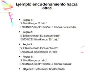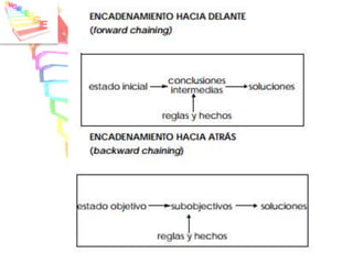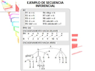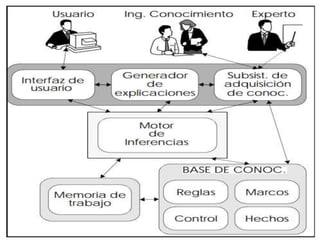 Este documento describe los componentes principales de un sistema basado en el conocimiento, incluyendo una base de conocimiento, una base de hechos, un motor de inferencias, una memoria de trabajo, una interfaz de usuario e ingeniero de conocimiento, y un generador de explicaciones. Explica que la base de conocimiento contiene conocimiento heurístico y de control, mientras que la base de hechos almacena datos y procedimientos. El motor de inferencias aplica reglas lógicas mediante encadenamiento hacia adelante y hacia atrás para extraer nueva información.