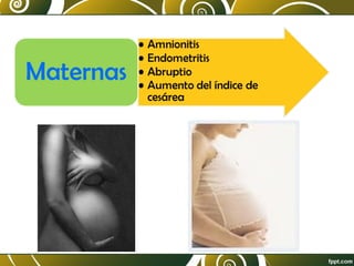 La ruptura prematura de membranas (RPM) se define como la salida del líquido amniótico antes del inicio del trabajo de parto, ocurriendo en un 1-3% de los embarazos y asociada con un alto riesgo de complicaciones para el feto. Los factores de riesgo incluyen infecciones, tabaquismo y traumas, y el tratamiento varía dependiendo de la edad gestacional, incluyendo reposo, antibióticos y maduración pulmonar. Complicaciones frecuentes de la RPM son infecciones, hipoxia y deformidades fetales.