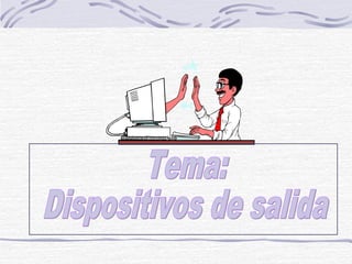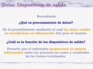 Este documento trata sobre dispositivos de salida en computadoras. Explica que los dispositivos de salida permiten al usuario obtener información de los procesos y resultados de la computadora. Describe los monitores y las impresoras como los dispositivos de salida más comunes, e incluye detalles sobre cómo funcionan y criterios para seleccionarlos.