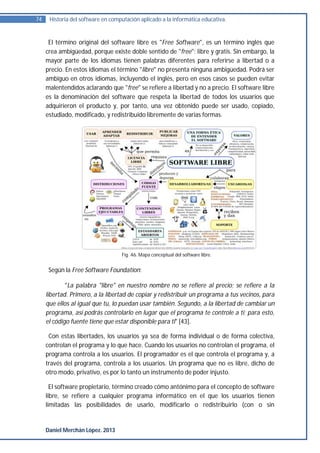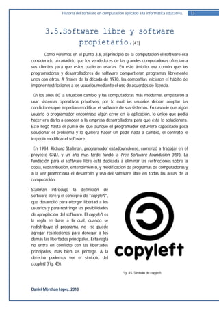 Este documento describe la historia del software libre y propietario. Explica que originalmente el software se compartía libremente, pero en los años 1980 las empresas comenzaron a imponer restricciones a través de licencias. En 1984, Richard Stallman fundó la Free Software Foundation para promover el desarrollo y uso de software libre. El software libre otorga a los usuarios cuatro libertades clave: ejecutar el programa para cualquier propósito, estudiar y modificar el código, redistribuir copias, y distribuir versiones modificadas.