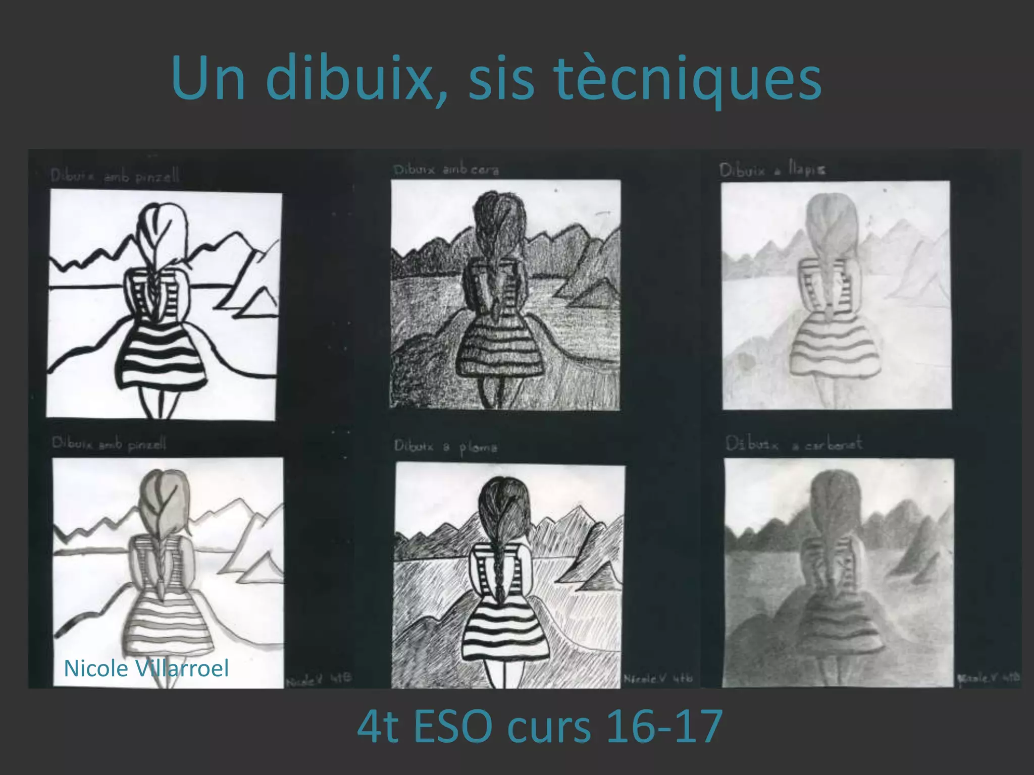 El documento contiene una lista de 14 nombres de estudiantes de 4o de ESO del curso 16-17 que participaron en un proyecto de dibujo utilizando seis técnicas dirigido por Nicole Villarroel.