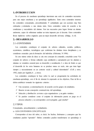Este documento trata sobre la evaluación de diferentes tipos de contenidos en el proceso de enseñanza y aprendizaje, incluyendo contenidos conceptuales, procedimentales y actitudinales. Explica que los contenidos conceptuales se refieren a hechos y conceptos, los contenidos procedimentales involucran habilidades y procesos, y los contenidos actitudinales comprenden valores y actitudes. Además, destaca la importancia de evaluar de manera integrada los tres tipos de contenidos para lograr un aprendizaje significativo y el desarrollo comple