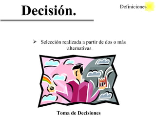 El documento describe el proceso de toma de decisiones, que consta de ocho pasos: identificar el problema, identificar criterios de decisión, asignar ponderación a los criterios, desarrollar alternativas, analizar alternativas, seleccionar una alternativa, implementar la alternativa seleccionada y evaluar la efectividad de la decisión. También discute diferentes tipos de problemas, condiciones y estilos en la toma de decisiones.