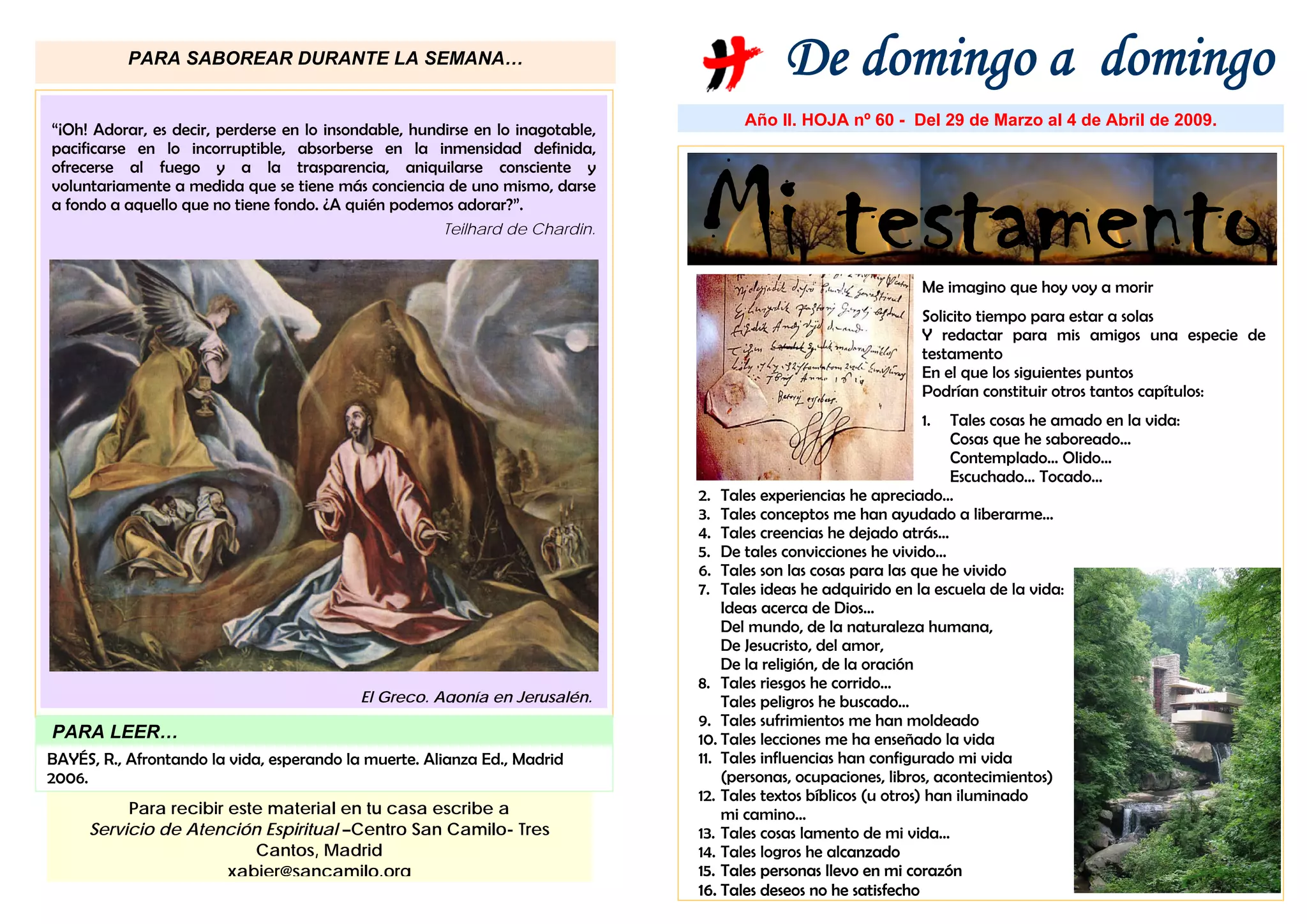 El documento presenta un poema que imagina un testamento escrito antes de morir. Se divide en 16 puntos que podrían constituir capítulos sobre las cosas amadas en la vida, experiencias apreciadas, conceptos que ayudaron a liberarse, creencias dejadas atrás, convicciones vividas, ideas adquiridas, riesgos corridos, sufrimientos que moldearon, lecciones aprendidas, influencias que configuraron la vida, textos bíblicos que iluminaron el camino, cosas lamentadas, logros alcanzados y personas en el cor
