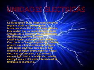 La introducción de las magnitudes eléctricas requirió una nueva unidad fundamental, el culombio (C), nombrado en honor a Charles-Augustin de Coulomb, quien midió primero la fuerza entre cargas eléctricas. Debido a la dificultad de medir directamente las cargas eléctricas, la unidad básica se estableció como el amperio, y la unidad de carga eléctrica, el culombio, se definió como la cantidad de carga que fluye a través de un conductor con una corriente de