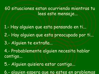 Este documento enumera 60 razones por las cuales vale la pena seguir vivo. Enumera situaciones en las que hay alguien que está pensando en la persona, que la extraña, que la necesita o que desea estar con ella. Destaca que hay personas que aman, admiran, apoyan y oran por la persona, y que su existencia es importante y valiosa para los demás.