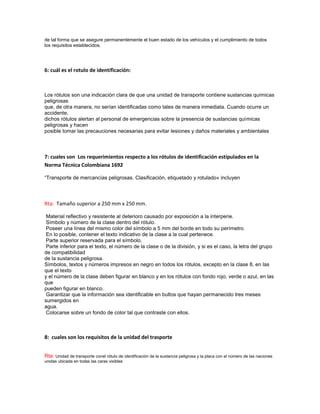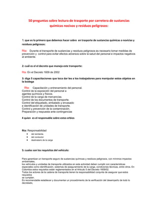 Este documento contiene preguntas y respuestas sobre los requisitos y procedimientos para el transporte seguro de sustancias químicas peligrosas y residuos. Algunos puntos clave son: 1) tomar medidas de prevención y control para proteger la salud y el ambiente, 2) el Decreto 1609 de 2002 regula este transporte en Colombia, 3) los vehículos deben cumplir con características especiales como identificación y aseguramiento de carga.