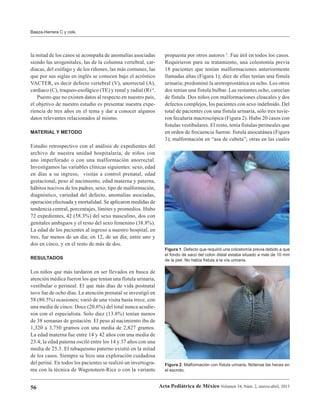 El documento presenta los resultados de un estudio retrospectivo de 3 años sobre 72 casos de ano imperforado. Se encontró que los varones representaron el 58.3% de los casos. La edad promedio de los pacientes fue de menos de un día. El 58.3% de los pacientes requirieron colostomía y solo el 23.6% presentaron malformaciones asociadas. El estudio concluye que el ano imperforado es una malformación anorrectal frecuente que a veces puede ser grave y sugiere la creación de un registro nacional obligatorio.