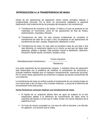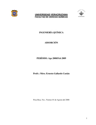 1) El documento describe los conceptos y aplicaciones de la absorción, un proceso de transferencia de masa donde un gas se disuelve selectivamente en un líquido. 2) Explica los fundamentos de la absorción, incluyendo el equilibrio entre fases gaseosa y líquida y las soluciones líquidas ideales. 3) Proporciona ejemplos de aplicaciones industriales como la absorción de H2S, CO2 y SO2 de corrientes de gas.