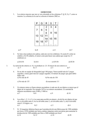 Este documento contiene 33 ejercicios de matemáticas con preguntas de selección múltiple. Los ejercicios cubren una variedad de temas matemáticos como números enteros, fracciones, promedios, geometría y estadística. El objetivo parece ser evaluar la comprensión y habilidades de resolución de problemas de un estudiante en estas diversas áreas.