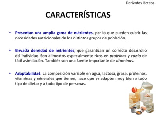 Este documento describe los derivados lácteos, incluyendo sus características nutricionales, propiedades saludables, y tipos como leches fermentadas y quesos. Explica que los derivados lácteos son ricos en proteínas, calcio, y vitaminas y pueden cubrir las necesidades nutricionales de distintos grupos. También destaca los beneficios para la salud ósea y cardiovascular en niños, adultos y ancianos.