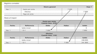 Este documento resume los principales libros y sistemas de registro contables como el diario general y el mayor general. Explica que el diario registra de manera cronológica todas las transacciones de un negocio y que luego esta información se pasa al mayor general, donde se registra de forma individual cada cuenta. También cubre el registro contable del IVA en México, incluyendo las tasas aplicables del 16%, 10% y 0% según el tipo de bienes y servicios.