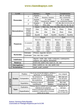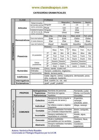 Este documento resume las principales categorías gramaticales del español, incluyendo determinantes, sustantivos, pronombres, adjetivos y sus clases y funciones. Explica formas, números, géneros, tipos y grados de cada categoría.