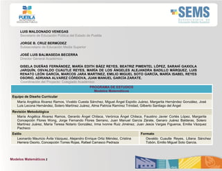 Este documento presenta el programa de estudios para el curso de Modelos Matemáticos del sexto semestre de bachillerato. El curso tiene una duración de 48 horas y 6 créditos. El contenido se estructura en tres unidades que abordan la introducción a modelos matemáticos, modelos de fenómenos sociales y modelos de ciencias experimentales. El curso contribuye al desarrollo de competencias genéricas y disciplinares relacionadas con la construcción e interpretación de modelos matemáticos. Los resultados de aprendizaje incluyen