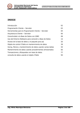 Este documento presenta información sobre tecnología cliente-servidor utilizando Java. Explica conceptos como programación cliente-servidor, herramientas como sockets y RPCs, la arquitectura de tres capas, y el acceso a bases de datos con JDBC. Describe los modelos de dos y tres capas para la conectividad a bases de datos, y clasifica los tipos de drivers JDBC. El objetivo general es proporcionar conocimientos sobre el desarrollo de aplicaciones cliente-servidor con Java y el acceso a bases de datos.