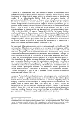 Este documento describe la evolución del análisis de políticas públicas desde el enfoque tradicional de toma de decisiones hacia el análisis de redes de políticas. Explica que el análisis de políticas ya no se centra únicamente en el gobierno, sino que involucra a múltiples actores. También analiza los cambios en el contexto institucional y cómo esto afecta los principios que guían el desarrollo de políticas públicas, introduciendo enfoques como la nueva gestión pública y la gestión de calidad total