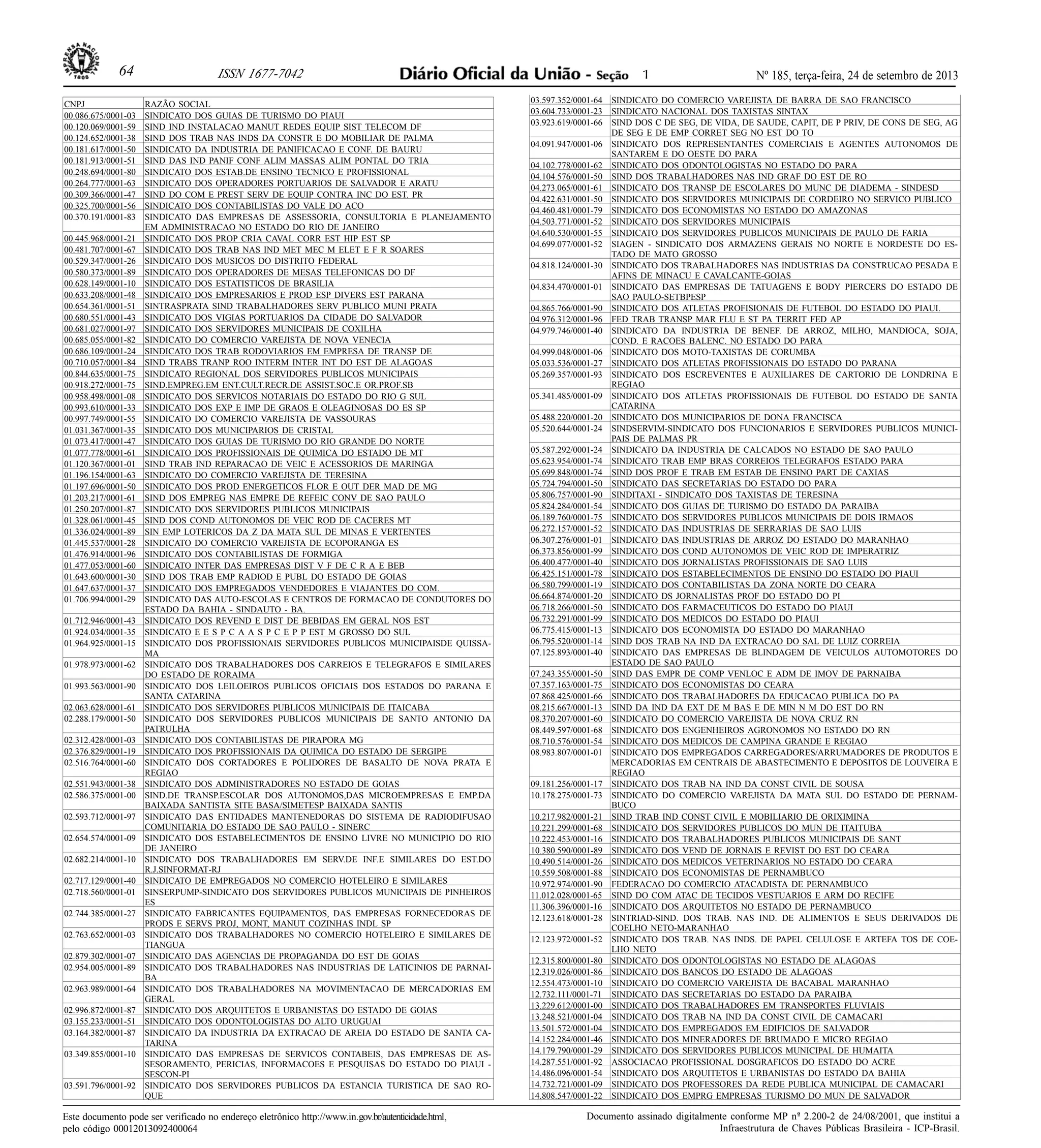 Este documento contiene una lista de más de 100 números de registro de la seguridad social y nombres de sindicatos brasileños. Incluye información como el número de registro de la seguridad social, nombre legal y ubicación geográfica de varios sindicatos a lo largo de Brasil.