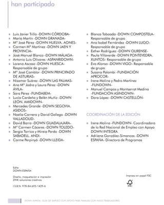 Este documento presenta una guía sobre el empleo con apoyo para familias con hijos trabajadores. Explica las cinco etapas del itinerario de integración laboral para personas con síndrome de Down, incluyendo la formación prelaboral, el acceso al puesto de trabajo, la entrada a la empresa, el entrenamiento y el seguimiento. La guía tiene como objetivo apoyar a las familias en el proceso de inserción laboral de sus hijos y resaltar su papel como agentes activos.