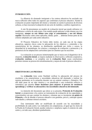 Este documento presenta un protocolo de evaluación inicial para alumnos de 5o curso de primaria que incluye pruebas en lengua española y literatura. El protocolo tiene como objetivo evaluar las capacidades y conocimientos de los alumnos para adaptar el proceso educativo a sus necesidades. La evaluación se estructura en cinco bloques de contenidos y proporciona indicadores de competencias y criterios de evaluación para cada ítem.