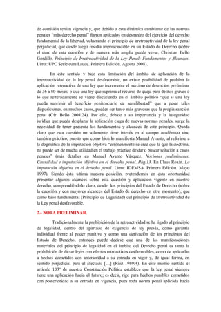 Este documento discute los alcances de la irretroactividad de la ley penal desfavorable y las normas procesales. Brevemente, explica que la irretroactividad se basa en el principio de legalidad para evitar la aplicación retroactiva de leyes que aumenten las sanciones o reduzcan los derechos de los acusados. También señala que las normas procesales se rigen por el principio de que la ley vigente al momento del acto procesal es la aplicable, pero no puede alterar procesos iniciados bajo leyes ant