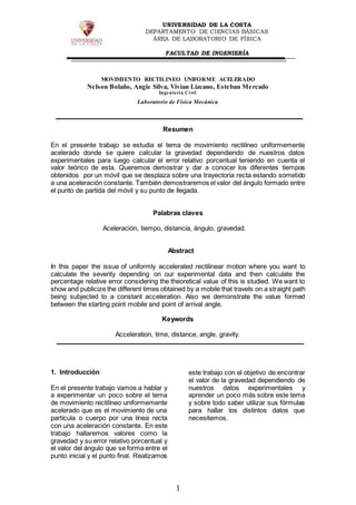 Este documento describe un experimento sobre el movimiento rectilíneo uniformemente acelerado. Los estudiantes midieron el tiempo que tardó un objeto en recorrer diferentes distancias sobre un plano inclinado. Utilizando estas mediciones y ecuaciones de movimiento, calcularon la gravedad, el ángulo de inclinación, y encontraron un error relativo del 0.091% en comparación con el valor teórico de la gravedad.