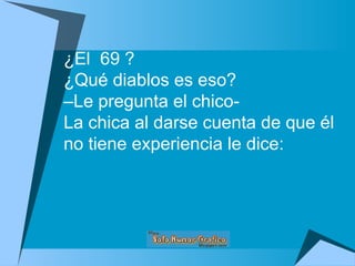 Una chica invita a un chico a su casa y le propone hacer el '69', pero él no sabe lo que es. Mientras intentan ejecutar la posición, la chica se tira dos pedos apestosos, causando que el chico se asuste y se vista para irse. El chico se va sorprendido, dejando claro que no está dispuesto a soportar más sorpresas.