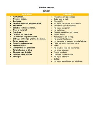Este documento lista los aciertos y errores de un grupo en su trabajo. Entre los aciertos se encuentran la puntualidad, realizar trabajos extras, asistencia y entregar tareas a tiempo. Entre los errores están dejar todo para el último momento, falta de atención y participación en clase, no estudiar para exámenes, y no actualizar el blog con la información requerida.
