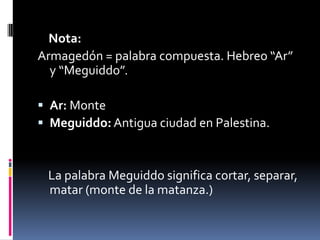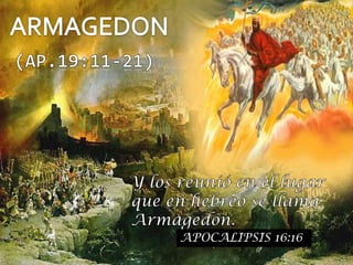 El documento describe la ubicación geográfica de Armagedón como un monte de poca altura en la entrada sur de la llanura de Jezreel en Palestina. Explica que el diablo reunirá aliados mediante "espíritus inmundos" para la batalla final en Armagedón según Apocalipsis 16. Detalla algunas formas en que los ejércitos del Anticristo serán destruidos como por el resplandor de la venida de Cristo y por los ángeles.