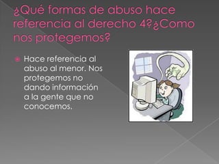 El documento habla sobre la protección de la información personal y privada de los menores en Internet, así como los riesgos del abuso y la divulgación de datos personales sin consentimiento. También menciona la importancia de establecer reglas para el uso seguro de la computadora y Internet, como terminar las tareas antes de acceder, y cómo los buenos hábitos y sitios web pueden ayudar a prevenir el racismo.