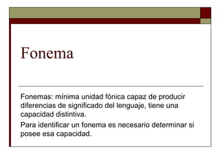 Este documento resume los conceptos básicos de fonología. Explica que los fonemas y sílabas tienen la capacidad de producir diferencias de significado aunque no tienen significado propio. Define fonemas como la unidad fónica mínima capaz de producir estas diferencias. Describe las clasificaciones de fonemas vocálicos y consonánticos, y conceptos como sílaba, oración, trastornos fonológicos e intervenciones para abordarlos. Explica los enfoques de evaluación e intervención fonológica que buscan mejor