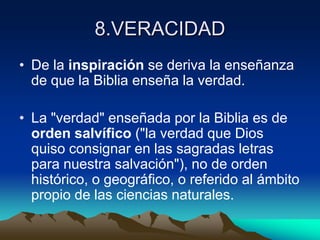 El documento discute la veracidad de la Biblia. Sostiene que la Biblia enseña la verdad salvífica pero no necesariamente la verdad histórica o científica. Explica que la Biblia usa un lenguaje simbólico accesible para las personas de todas las épocas y que no pretende enseñar sobre temas científicos. También reconoce posibles problemas científicos, históricos y morales en la Biblia debido a que sus autores estaban limitados por los conocimientos de su época, pero que