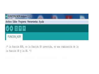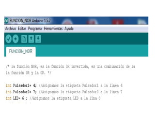 La función NOR equivale a la negación de la función OR. En este documento, se explica cómo programar una función NOR en Arduino para encender un LED cuando se pulse cualquier combinación de dos pulsadores, excepto si se pulsan ambos a la vez. Se definen los pines de entrada y salida, y la instrucción digitalWrite establece la salida LED en 0 cuando cualquier entrada sea 1, implementando así la función NOR.