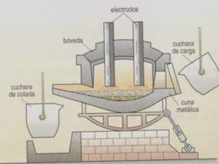 Este documento trata sobre los materiales ferrosos. Explica que los materiales ferrosos tienen como constituyente principal el hierro y se pueden clasificar en hierro, aceros, fundiciones y ferroaleaciones. Luego describe los procesos históricos para la obtención del hierro y el desarrollo de la siderurgia a través de los años. Finalmente, explica los procesos actuales para la obtención del acero como el alto horno, hornos eléctricos y convertidores, así como los diferentes tipos de productos siderúrgicos.