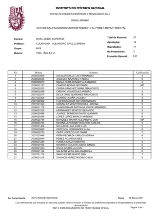Este documento es el acta de calificaciones del primer departamental de la materia de Inglés VI para el grupo 6IV9 del nivel medio superior de la carrera de Tecnología en Sistemas Computacionales. Presenta la lista de 27 alumnos con su número de boleta, nombre y calificación. De los 27 alumnos, 14 aprobaron, 11 reprobaron y 2 no se presentaron. El promedio general fue de 5.37.