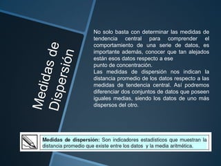 Este documento introduce las medidas de dispersión como una forma de determinar cuán alejados están los datos de una serie respecto al punto de concentración central. Explica que la desviación media, varianza y desviación estándar son tres medidas de dispersión básicas, calculadas en base a la media aritmética. A través de ejemplos, muestra cómo calcular cada una de estas medidas y cómo pueden usarse para diferenciar conjuntos de datos con la misma media pero diferente dispersión.