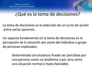 El documento habla sobre la toma de decisiones. Explica que existen decisiones programadas, que son recurrentes y están establecidas en políticas, y decisiones no programadas que requieren una solución específica. También describe el proceso de toma de decisiones, que incluye definir el problema, buscar información, evaluar alternativas y elegir la mejor opción. Finalmente, señala que las decisiones pueden ser individuales o tomadas en grupo, donde se consideran ventajas y desventajas de ambos métodos.