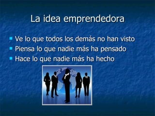 El documento describe los procedimientos del pensamiento creativo para desarrollar una idea emprendedora novedosa, incluyendo recopilar información, reelaborarla y organizarla, incubar la idea, tener una iluminación e implementar la idea final. También recomienda analizar cambios y necesidades del mercado, y estudiar cómo ofrecer productos y servicios conocidos de nuevas formas, usando técnicas como tormentas de ideas y pensamiento lateral para estimular la creación de ideas.