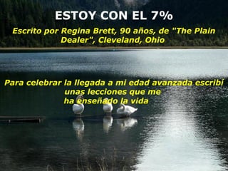 Este documento contiene las lecciones de vida de Regina Brett a sus 90 años. Incluye consejos como apreciar cada día, mantenerse en contacto con amigos y familia cuando estés enfermo, no comparar tu vida con la de otros, perdonar a los demás, y vivir la vida al máximo cada día ya que es un regalo. El documento finaliza instando a las personas a reenviar el mensaje si forman parte del 7% que cree en compartir sabiduría sobre la vida.