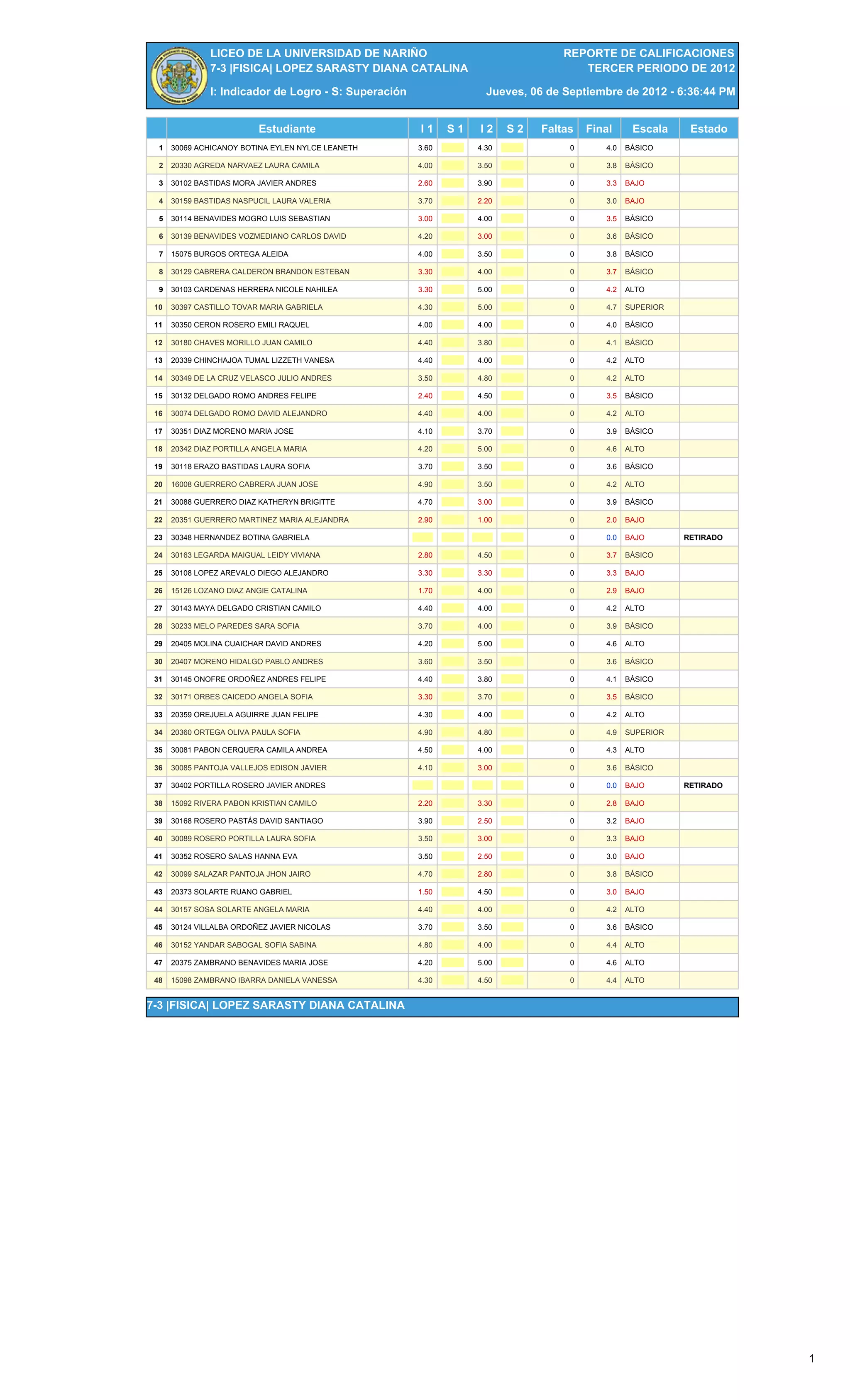 Este documento presenta el reporte de calificaciones del tercer período de 2012 para el curso de Física impartido por Diana Catalina López Sarasty. Contiene la lista de 48 estudiantes con sus calificaciones para los indicadores de logro 1 y 2, las faltas acumuladas, la calificación final, la escala de desempeño y el estado académico para cada uno.