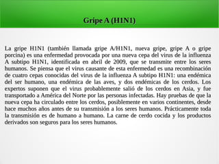 Este documento describe la gripe porcina H1N1. Explica que el virus H1N1 se transmite entre cerdos y rara vez infecta a humanos, pero una cepa emergió en 2009 que podía transmitirse entre personas. Describe los síntomas como fiebre, tos y dolores musculares. También menciona tratamientos como medicamentos antivirales y vacunas, así como medidas para prevenir la propagación como lavarse las manos y cubrirse al toser.